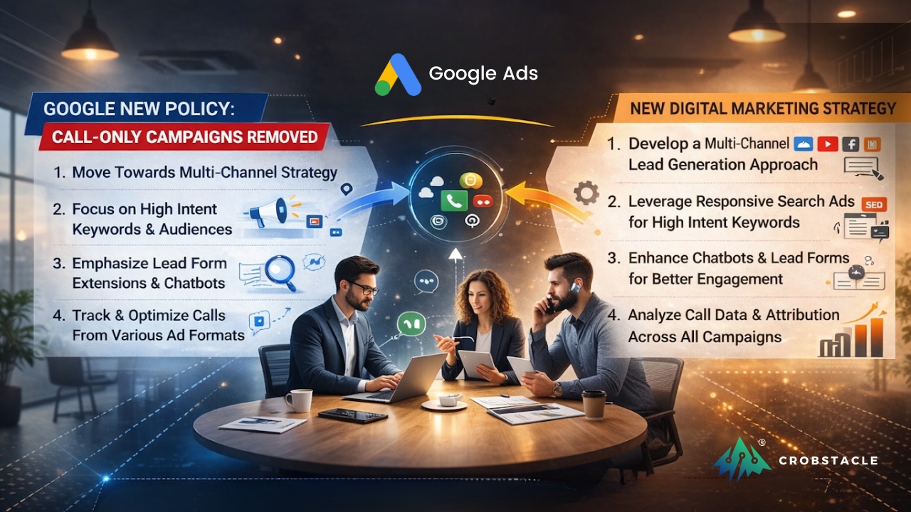 The removal of Call Only campaigns is part of Google Ads’ evolution toward unified, intent based advertising. Businesses that adapt early will benefit from stronger optimization, clearer reporting, and more sustainable performance over time. For brands that depend on inbound calls, this transition should be approached proactively. Waiting until the format is fully discontinued increases risk and limits strategic flexibility. At Crobstacle, our approach is grounded in hands on experience managing performance driven Google Ads accounts across industries. We focus on building future ready systems that align with how Google Ads is evolving, not how it worked in the past. If you would like to understand how this Google Ads update impacts your current campaigns, or if you want clarity on how we are restructuring accounts to maintain and scale call driven performance, you can reach out to us for a free 30 minute consultation call. We will walk you through what is changing in your account, what actions are required if any, and how to transition without risking lead flow.
